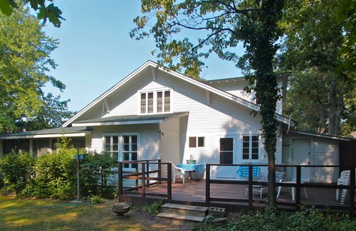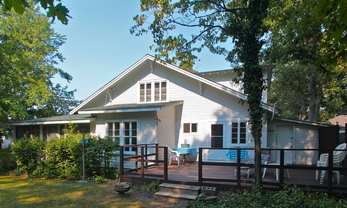 Walk to the lake, bike through the dunes, golf on the links and then enjoy the woodland view from the deck or the enclosed porch. The short walk to the shore is still available but sand conditions vary depending on the lake level & Mother Nature. This charming cottage has 3 bedrooms and 2 baths, plus a futon in a separate room. Several large tables provide space for family dining and playing games. Brand new washing machine and dryer for 2022!