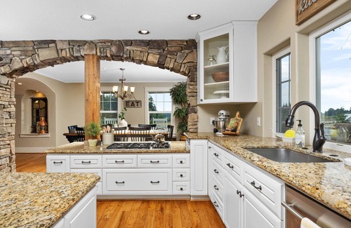 The farmhouse has been recently updated with new décor and furnishing to help create that perfect blend of comfort and style. Upon entering the main level you are greeted with a bright and open foyer. One entire side of this home enjoys a huge open living, dining, and kitchen layout making it the perfect place for incredible meals and amazing memories. Both in the kitchen, and other areas of the home you will find a blend of countertops at both average height and a bit lower. If you absolutely must get some work done while staying, there are two great office spaces so you can be productive between your adventures.