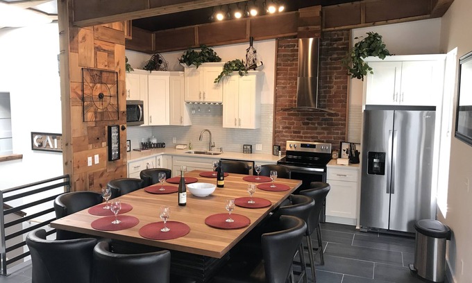 The Castle loft is a 1700 Sq ft 2 story venue w/ a wide open 3rd floor for gatherings and a private entrance. This gourmet kitchen is the entertainment Hub for all. High top table for 10.