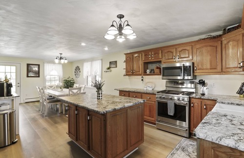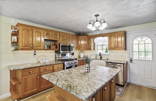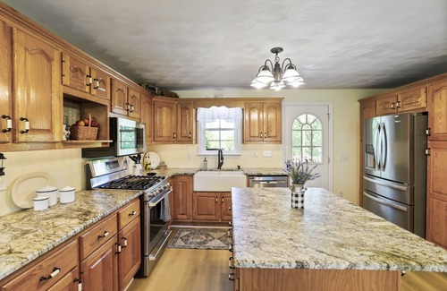 Inside the home, you'll find hardwood floors throughout, a spacious and fully equipped kitchen with granite countertops, modern appliances, and a bright, open layout that makes gathering easy and comfortable. Each of the three bedrooms is designed with comfort in mind, offering cozy beds, soft linens, and peaceful views. With 2.5 bathrooms, there's plenty of space for everyone to refresh after a day outdoors.