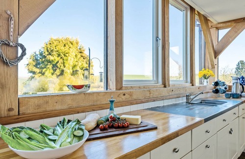 Wylye Croft is a spacious detached house, with open-plan and sociable day space, including a double-height sitting and dining area with wood burning stove and exposed beams. To take full advantage of the special views across the surrounding hills, valley and village, there are floor to ceiling glazed doors and numerous windows allowing the light to flood in, and a large deck area with garden furniture. On the ground floor, the well-appointed accommodation includes an open plan kitchen with range cooker and breakfast island, a separate dining area, and a large sitting area which faces the fireplace with its wood burning stove. The living area has high ceilings and exposed beams, and leads through to a library area with well-stocked shelves so you are bound to find something interesting to read. The separate snug and television room is generously equipped with a large selection of board games, and also has glass doors which lead out to a second deck and the large wrap around garden.