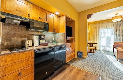 This spacious studio suite measures approximately 419 square feet. You will enjoy a king bed and one queen sleeper sofa in the living area including a kitchenette and bathroom. Maximum occupancy is four.