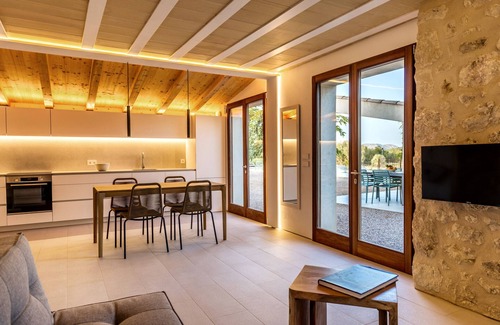 Welcome to Xanet! A beautiful finca with a pool near Pollença. Xanet is modern and Mallorcan at the same time. The finca has been skilfully restored and equipped with a photovoltaic system in a sustainable and energy-efficient way.The Finca Xanet is straight-lined, modern and completely restored with a lot of charm. Loft-like and on 2 floors, traditional quarry stone walls are combined with stylish, contemporary furniture. When restoring the house, the architect managed to merge the advantages of old and new into an atmospheric unit.The approximately 85 square meters comfortably accommodate 2 guests. In the double room with air conditioning and private bathroom en suite with walk-in shower, you can spend pleasant, restful nights. The bedroom has a king-size bed (180x200cm) and is on the upper floor.On the ground floor you will also find a beautiful, spacious living room and a dining area with an open kitchen.The outside area of the finca is lovingly designed with a covered, fully equipped terrace and a beautiful pool area. The 12m x 3m saltwater pool is of course a stylish eye-catcher and invites you to take a long swim. From here you can enjoy the fantastic view of the landscape and mountains in the background.At a glance | Country house on a 7,000 sqm property, living space 85 sqm | 2 guests | Interior designed like a loft, open staircase to the double room with en suite bathroom on the upper floor | Kitchen, living room and dining area on the lower floor | 12 x 3 m saltwater pool, terraces, garden, charcoal grill | additional shower, sink, toilet by the pool | Air conditioning | Internet connection | Extensive view over the landscape and Tramuntana mountains in the backgroundFlair | modern, at the same time Mallorcan, straight lines, stylish, restored with charm, in the middle of nature, sustainable, energy efficient