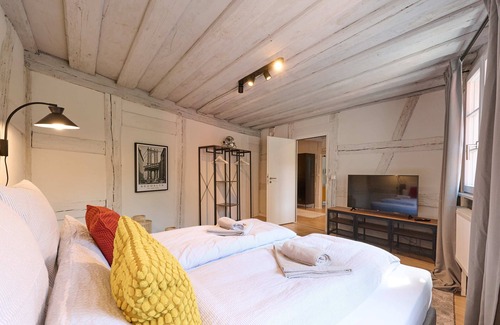 The strict requirements for monument protection are what give it a special charm - the walls, ceilings and floors have been painstakingly repaired. Please note the half-timbering on the walls, some wooden thresholds and some low door frames.