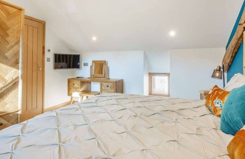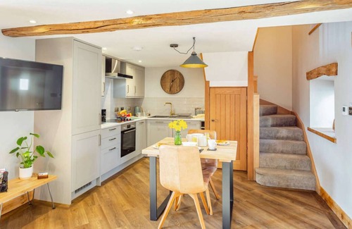 Lovingly renovated, this two-storey barn conversion exudes warmth and character. Wooden beams and upcycled farm equipment add rustic charm, while stylish furniture and underfloor heating ensure it has everything you need for a comfortable stay. Compact and thoughtfully designed, the kitchen is well equipped to prepare delicious home-cooked fare. Romantic meals can be savoured on the dining table for two or at the bistro table on your private patio. Then snuggle up on the plush sofas for a cosy night in. Upstairs, a charming super-king-size bedroom ensures a restful night’s sleep, and the contemporary bathroom allows you to refresh with ease.