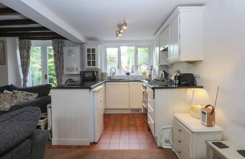Downstairs is a cosy open plan living room, comfortable sofas ranged around a stone inglenook fireplace with a coal effect fire, a dining table and chairs for four, a TV with Freeview, CD/DVD player. The kitchen area is well equipped with electric oven, gas hob, microwave, fridge with freezer compartment and washing machine.French windows open out onto a well-managed terraced garden.