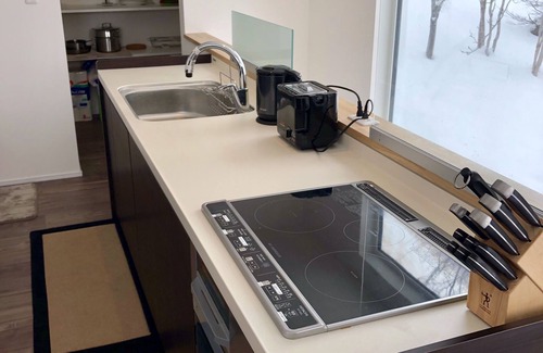 Located near world-renowned powder skiing and snowboarding at Hanazono, Hirafu and Annupuri, this new build chalet offers the perfect base for families and groups of friends alike. Situated in a private setting the chalet is spread across three levels providing plenty of storage space for outdoor equipment, including an indoor parking space. As you enter the ground floor you will find the dry room alongside the washer dryer, airing rack and ample hanging space where all outdoor equipment can be left to dry, ready for the next day! On the second floor, you'll find the three bedrooms. The master bedroom is equipped with a queen size bed, the second with two comfortable single beds, while the third, ideal for children includes adult sized bunk beds. The third floor is a natural gathering area with the open space living and dining area as well as the kitchen overlooking the snowy trees in the winter or lush greenery in the summertime. After a day of activities relax in the living room and enjoy a film on the Apple TV function. The fully equipped kitchen allows you to prepare delicious meals in an open setting. A semi-closed pantry to the side of the kitchen provides a variety of amenities including a microwave, dishes, utensils and basic cookware.