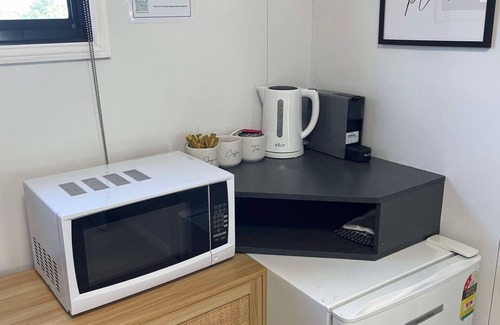 For your convenience, the cabin is equipped with a coffee machine, a selection of coffee pods, and a variety of teas. You’ll also find a microwave, cutlery, and a small refrigerator to make your stay even more comfortable.