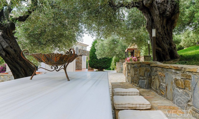 An open-plan suite on the ground floor of a charming villa, featuring 2 double beds and 2 bathrooms. The apartment is set on a land plot of 2000sqm, offers stunning green views and has exclusive use of the barbecue area with dining table. Only 2' drive (10' walk) to Lagomandra beach, the property is ideal for small families or group of friends seeking tranquility and relaxation. The suite is fully equipped to ensure a comfortable stay, with close proximity to local amenities and the sea.
