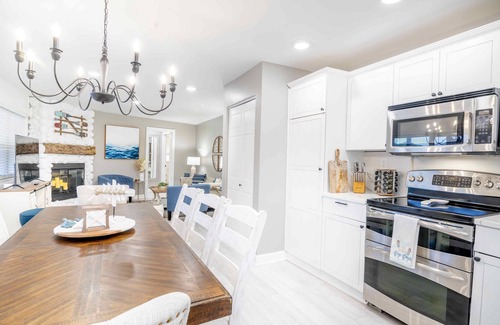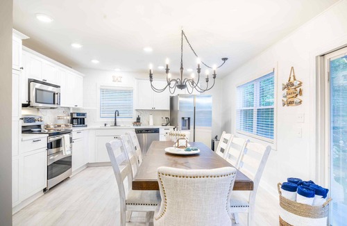 The fully equipped kitchen features top-of-the-line stainless steel appliances, stunning quartz countertops and backsplash, and all the coffee-making essentials to start your day off right. But that's not all - with decks, docks, and flip flops at your disposal, you can make the most of your time in this beautiful vacation home.