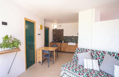 ° on the other side, a sofa bed above which an open porthole floods the apartment with light and color;