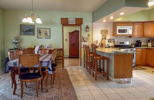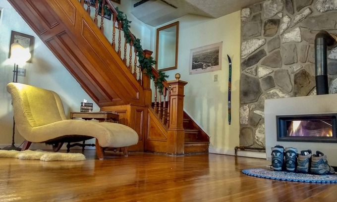 Our second home is spacious and clean, in a great location and terrific for families or groups of friends! There are 4 bedrooms upstairs and can easily sleep 10. The kitchen is big with a gas stove and all the amenities for people who love to cook. The living room has a big TV for movie night as well as a table in the dining that can seat 12 for games or meals. The bedrooms are "Bear Lair" with a queen bed, "Velociraptor's Den" with a double bed and a day bed, "Falcons Nest" with a twin bed and "Ma Chambre" with a queen bed. There is an office off this room that has an airbed you can use. We have a locked shed with kayaks you can borrow or safely store your own bicycles etc. The entrance to the house has a big mud room so you can leave your dirty shoes, skis, bicycles there. There's a porch upstairs off the master bedroom. The lawn is great for outside games and we have a shared fire pit.