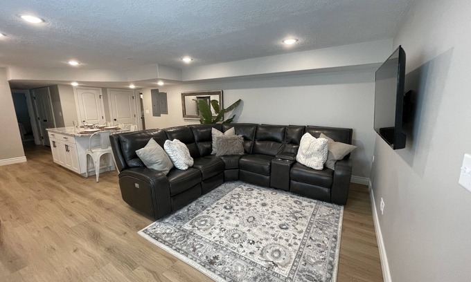 Work, recreation, and rest--we've got you covered! This beautiful basement apartment, with private entrance, boasts a defined office space with a sit-stand work station and blazing fast internet to power your busy day. Then, sit back on the leather, power-reclining sectional for your favorite movie or unwind in a hot bath. Later, curl up on a queen-size, gel-and poly-foam mattress for a pressure-relieving, restful sleep. This home away is footsteps from Santaquin Canyon, less than two miles from public amenities (freeway on-ramps, Macy's, Rowley's Red Barn, multiple restaurants, a library, and even a splash pad), and a hop, skip, and a jump to multiple hospitals tech companies, and universities.