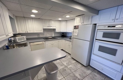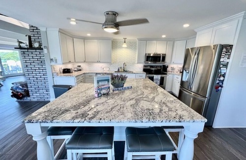 Spread over three finished levels, this 5 bedroom (plus bonus sleeping loft) home is perfectly suited for larger groups. It can sleep up to 15 if needed. A large top floor lofted bunk room has five single beds, a half bathroom and is accessed by a spiral staircase from the living room. The main floor of the home has the kitchen/dining/living areas, a primary bedroom with a queen bed and ensuite bath and another bedroom with a king bed. There is also another full bathroom on the main floor. The walkout lower level of the home has a secondary kitchen, three more bedrooms (all with queen beds), a full bathroom and an amazing rec room with a billiards table! The home has a wall mounted AC unit in the upper level bunk room, a wall mounted AC unit in the main floor living room and a wall mounted AC unit in the lower level rec room. The 2 bedrooms on the main floor have window units ACs.