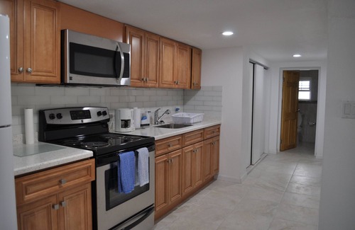 The kitchen is fully equipped with china, glasses and cooking essentials. Small appliances to include: toaster, kettle, coffee maker. Major appliances: electric stove, full fridge with a freezer and full size microwave.