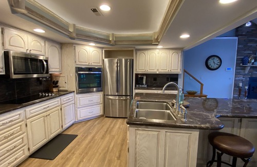 Downstairs, on the first floor, is the living level of the home. Every cook will enjoy the beautiful kitchen with granite counters, breakfast bar, stainless appliances, dishwasher, and trash compactor. Both the kitchen and dining room have combined seating for 12 people. From both rooms you can enjoy the rock-faced fireplace and a flat screen TV. Just off the kitchen is a great lake-view bedroom with a king-sized bed, tv and hall bath with walk in shower. And access to the laundry room with extra storage for coolers.