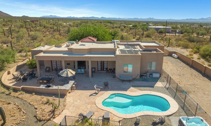 Perfect group retreat! This is more than a vacation home, it’s an experience! This unique resort like home sits on 5 acres at the gates of SAGUARO NATIONAL PARK, in the pictures rocks area of Tucson. Mountain Views with The Majestic Arizona sunset and sunrise right from your backyard. Relax in your private in-ground pool (not heated) and hot tub. Outdoor Bbq and bar, fire pit and many more amenities. Easily accommodate group trips, comfortably fitting 10-12 people. Your Oasis in the desert awaits you!