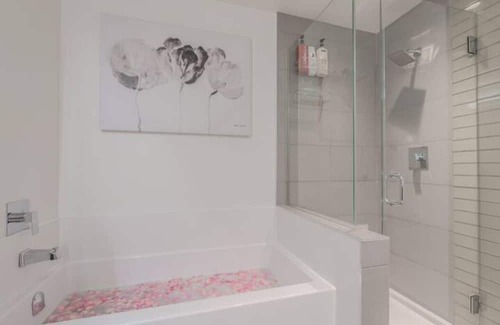 Unwind in style at our chic Calgary unit near the vibrant 17th Ave. Explore nearby attractions, cafes, and entertainment. Step into a modern oasis with a sleek grey couch, adorned with plush blue pillows, complemented by a luxurious blue carpet. Large, captivating paintings grace the walls, creating an artistic ambiance. Sink into the inviting bed for a restful night and refresh in the modern bathroom with a shower and tub. Welcome to your epitome of cozy luxury in the heart of the city.