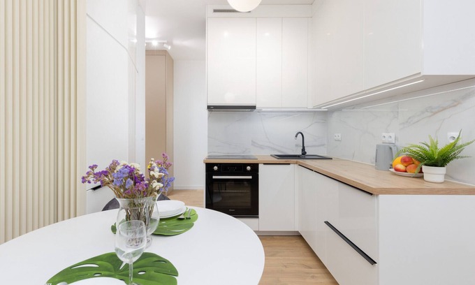 This modern and comfortable apartment is located on Złoty Potok Street on a modern housing estate, next to the business district of Mokotów. The new housing estate is an exceptional investment filled with greenery. Well-thought out architectural design consists of intimate buildings located at a comfortable distance from each other. The central point of the estate is a charming lake, which together with numerous green areas creates a unique ecosystem conducive to spending time outdoors. For the convenience of residents, there are many restaurants, stores, gym, pharmacies, bakeries in the neighborhood. To increase the sense of security, the estate is guarded and has a reception desk. The location ensures easy access to other districts, both by public and private transport. A great advantage for international guests is the proximity to Chopin Airport, which can be reached in 15 minutes by car. Moreover, the nearest metro stations (Sluzewiec and Ursynów) are a 10 minute car drive away.