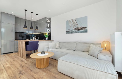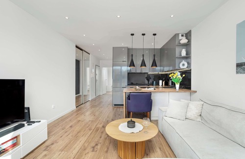 This 47-square-meter apartment is designed to provide maximum comfort for business and leisure travelers. In the spacious living room, guests can relax on the sofa bed, which also serves as a comfortable sleeping area. Large windows let in plenty of natural light, which positively influences the mood and makes the interior cozy and bright throughout the day. A Smart TV with access to your favorite apps and high-speed WiFi allow you to relax with TV series, movies or music after a day of sightseeing. The kitchenette has been decorated with great attention to functionality. There is an induction cooktop, oven, electric kettle, refrigerator with freezer, as well as the necessary kitchen utensils and a set of dishes, allowing you to easily prepare both a quick breakfast and a more complex dinner. The kitchen space is perfectly lit and stylistically consistent with the rest of the apartment, making cooking a natural part of the daily rhythm. The separate bedroom has a comfortable double bed for a restful and restorative sleep. A closet and bedside cabinets with lamps are also at guests' disposal, allowing for convenient storage of personal belongings and creating the right conditions for evening relaxation. The bathroom is equipped with a spacious shower, toilet, cabinet with mirror and sink, as well as a set of cosmetics and towels. There is also a washing machine and a hair dryer, which will be ideal for longer stays and family trips. The whole room was designed in a subdued, calm color scheme, which promotes tranquility and relaxation. It's a thoughtful interior that combines the convenience of a home stay with the functionality of a hotel.