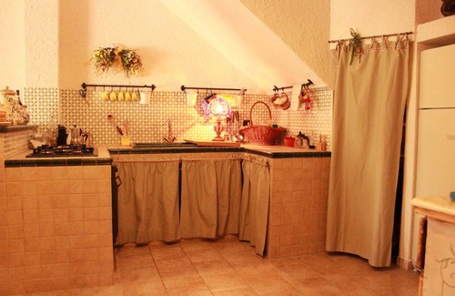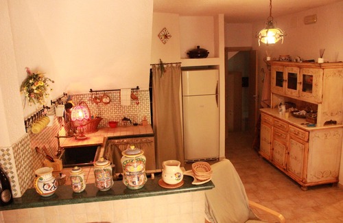 The house is on two levels: on the top floor there is a beautiful studio furnished in a shabby style with a double sofa bed, kitchenette and bathroom. A veranda with garden and tiled table. Downstairs (countryside floor) there is a beautiful and fresh patio with table, worktop with sink and outdoor kitchen in addition to a wood oven and barbeque. Inside a large room with built-in kitchen and sofa bed. Two bedrooms, one double and one with two bunk beds.
