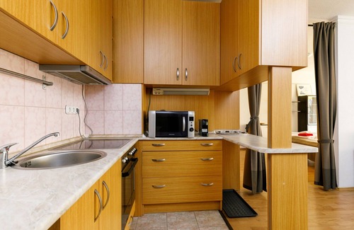 "Zamia 1", 2-room apartment on 3rd floor, south-west facing position. Partly renovated, practical and comfortable furnishings: 1 open double bedroom with 1 french bed (160 cm, length 200 cm). Exit to the balcony. Living/sleeping room with 1 double sofabed (140 cm, length 200 cm), dining table, cable TV and air conditioning. Exit to the balcony. Open kitchen (oven, 4 ceramic glass hob hotplates, toaster, kettle, microwave, freezer). Shower/WC. No heating option. Balcony furniture. Beautiful panoramic view of the lake. Facilities: mosquito net, children's high chair, baby cot (extra). Internet (WiFi). Parking.
