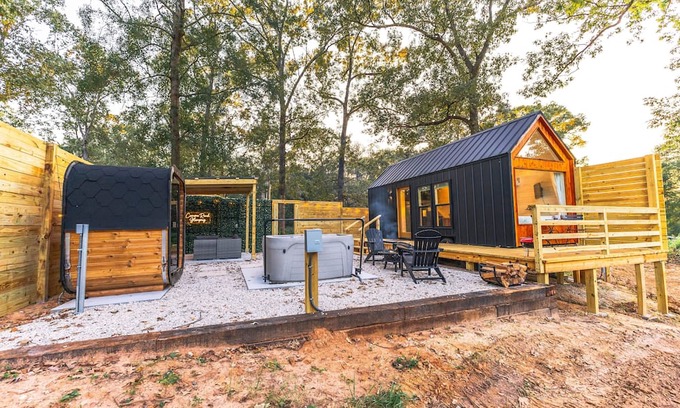 Outside, your private oasis includes a bubbling hot tub, wood-burning fire pit, sauna, gas grill/pizza oven, and a covered lounge area perfect for slow mornings with coffee or late nights under the stars. Inside, a queen memory foam bed, modern bathroom, and thoughtfully stocked kitchenette (fridge, microwave, two-top stove, coffee maker, and cookware) give you all the comforts of home—plus Wi-Fi, TV, books, and games for cozy nights in.
