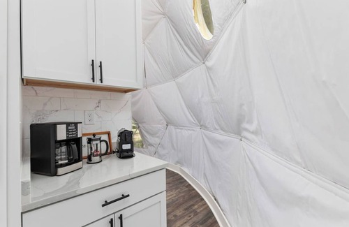 The dome features a compact, yet fully stocked kitchen. Main features include modern appliances for preparing a full meals. There is also a dedicated dining table with 4 chairs to share your meals. The tap water is good to drink here as well!