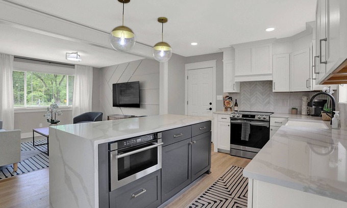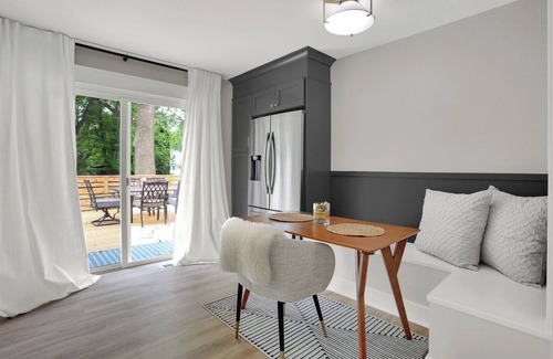 Professionally designed with a Midwestern Hampton’s Vibe. Centrally located 1.5 miles from downtown Zionsville, 14 miles from Grand Park and 30 minutes from downtown Indy. Walking trails across the street and Zionsville Golf Course within walking distance. Stay comfortably in Zionsville at this 3-bedroom house. Complete with a fully stocked Chef’s kitchen and upgraded stainless steel appliances. Four smart TV’s with Roku in every room. Samsung washer and dryer and a 30 foot deck in the back for morning coffee outside or dinner on the deck. The bedrooms are featured as follows: 1 king bed, 1 queen bed, and 1 bunk bed. This set-up is perfect for families or friends traveling together. Enjoy the convenience of amenities like AC, WiFi, and a washing machine. The bathrooms are equipped with complimentary soaps and a hair dryer available for your comfort and convenience.