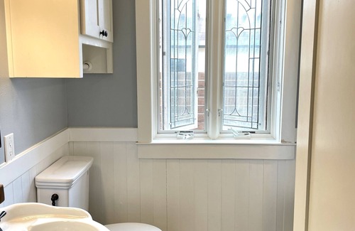 Unwind in the luxurious bathroom adorned with a porcelain clawfoot tub, soft towels, and complimentary shampoo and conditioner, offering a soothing oasis after a day of exploration.