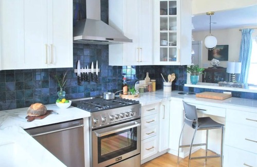 With a designer's eye - the home has a fully-stocked remodeled modern kitchen with brand new luxury appliances, a cozy breakfast nook, two comfortable living rooms (one with a piano; the other with a library of books and TV), plus a dining room for entertaining up to 10 guests.